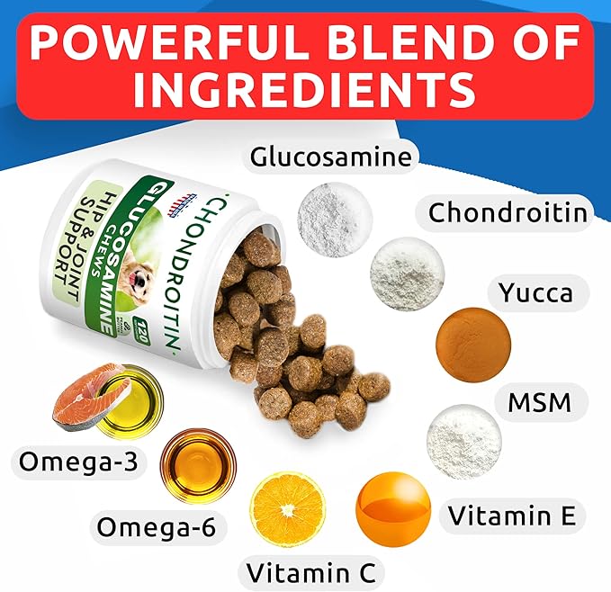 • Vet-Approved Formula: With glucosamine, chondroitin, MSM sulfate & Omega-3-6, our dog hip and joint supplement is the best natural support for your buddy's mobility. Plus, these bites extend the benefits to your pup's flexibility and comfort.