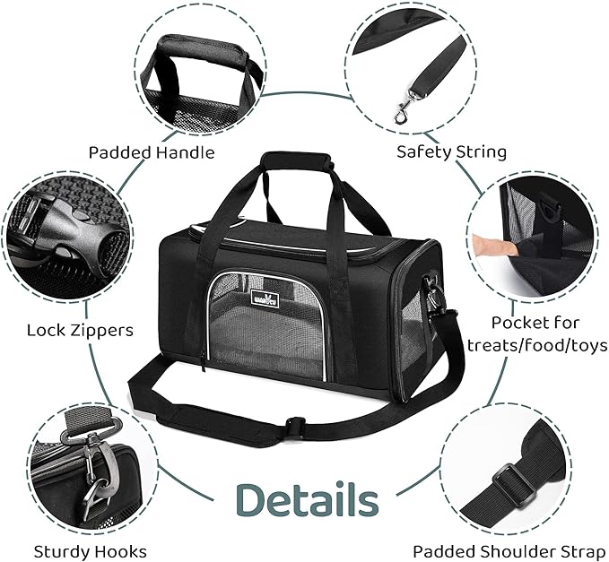 TSA Approved Pet Carrier for Small Medium Cats and Dogs | Dog Carrier with Adequate Ventilation | 4 Mesh Windows, 3 Entrance, Locking Safety Zippers, Padded Shoulder Strap, Black