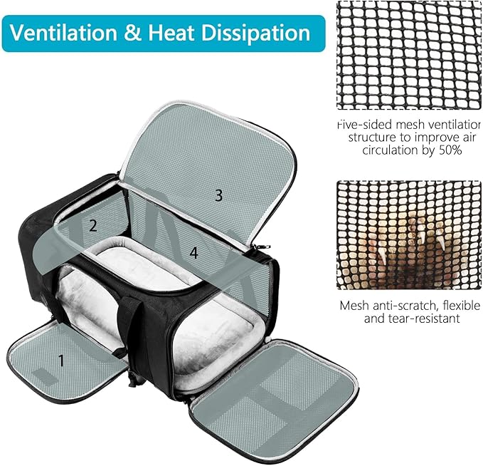 • 🐶【3 ENTRANCES & 5 SIDE VENTILATION】: The zippered design of the top, front and side entrances of the case makes it easy to put in and carry out your pet, making it faster and easier to remove your pet from pet carrier while traveling through security checks. 5 breathable mesh windows are designed to enhance visibility and ventilation, which can make them feel relaxed and calm.