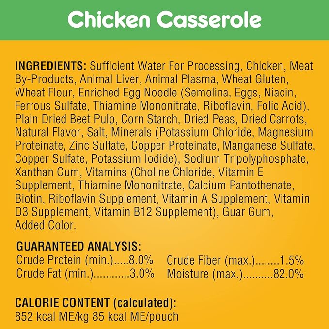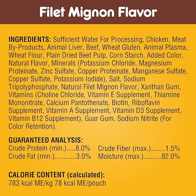 • Flavors Dogs Love: This variety pack contains 48 (3.5 oz.) pouches in the following flavors: (12) Hickory Smoked Chicken (12) Filet Mignon (12) Chicken Casserole and (12) Beef, Noodle and Vegetable