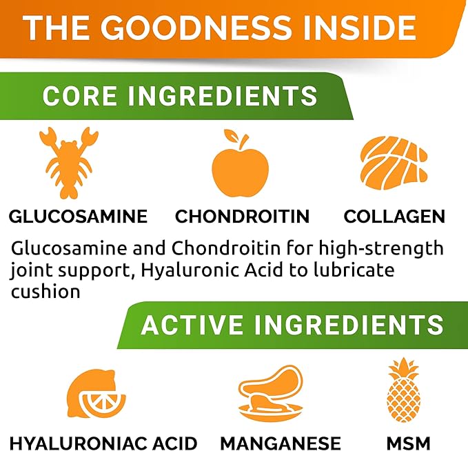 • NATURAL PREMIUM INGREDIENTS – each spoon of our liquid supplement contains a complex of Glucosamine, Chondroitin, MSM, Manganese, Collagen, Hyaluronic Acid among active ingredients for joint support for dogs, strong bones, improve doggy's energy and mobility.