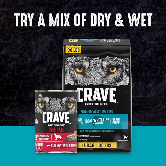 • Contains one (1) 30 lb. bag of CRAVE Grain Free Adult Dry Dog Food with Protein from White Fish and Salmon—for any size dog