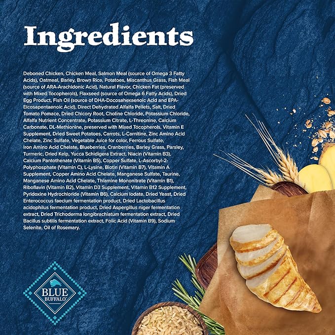 • NATURAL INGREDIENTS: Blue Buffalo dry dog food is made with the finest natural ingredients enhanced with vitamins, minerals, and other nutrients; It contains NO chicken (or poultry) by-product meals, NO corn, wheat, or soy, and NO artificial flavors or preservatives