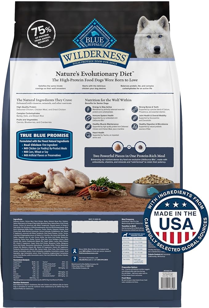 • SUPPORTS SENIOR DOG HEALTH: Blue Buffalo Wilderness Recipe dry dog food is packed with whole grains, vitamins, and minerals and is ideal for providing your senior dog with energy and nutrition
