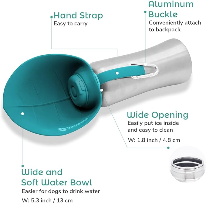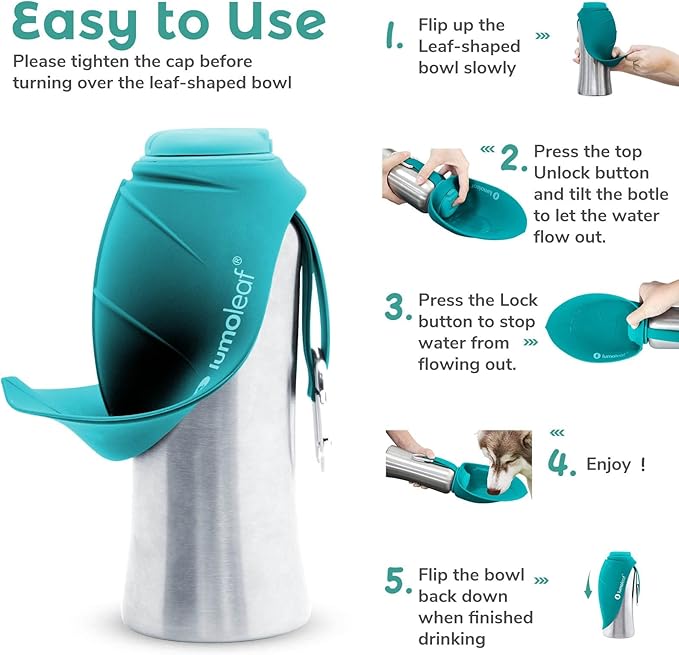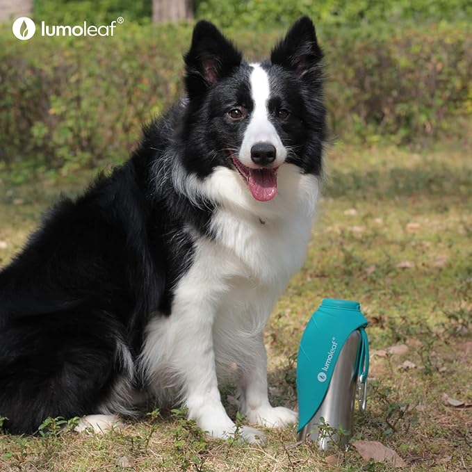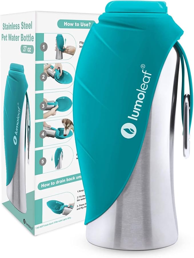 • ❤️KEEP YOUR PET HYDRATED anytime and anywhere with LumoLeaf Portable Dog Water Bottle. Holding up to 27 oz water, the Stainless Steel water bottle for dog is suitable for small, medium and large breeds.