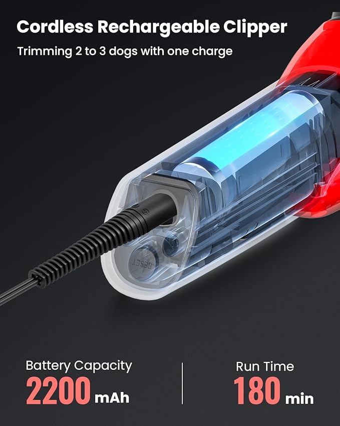 • 【Long-lasting Cordless Clipper for Grooming】 Just grab and go. You’ll be able to groom your pet anywhere you want with the convenient cordless design. Extensive 180 minutes of runtime per charge allows you to groom 2-3 dogs uninterruptedly. For safety concern, the clipper won’t turn on while being charged, and the charging cable should be fully plugged into the clipper charging port or it won’t charge. Scissors, lubricating oil, 4 adjustable attachments (1/8", 1/4", 1/3", 1/2") are all included.