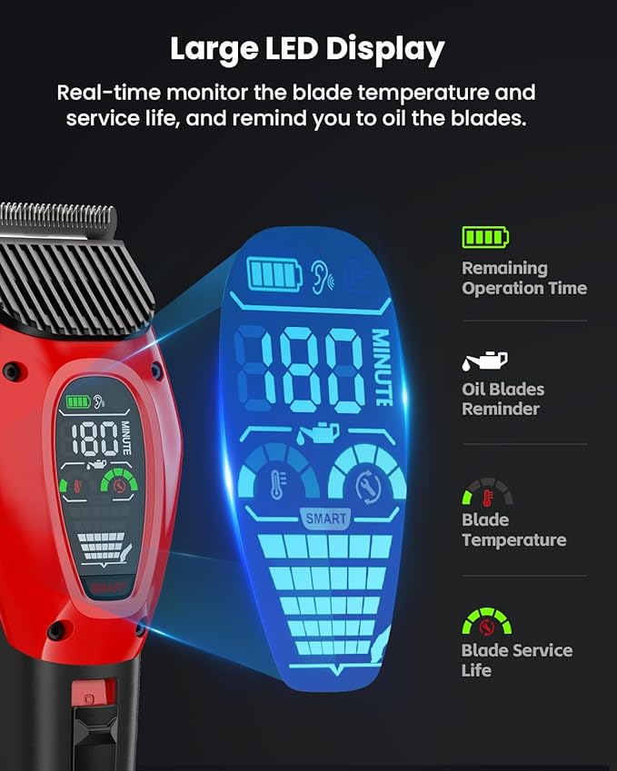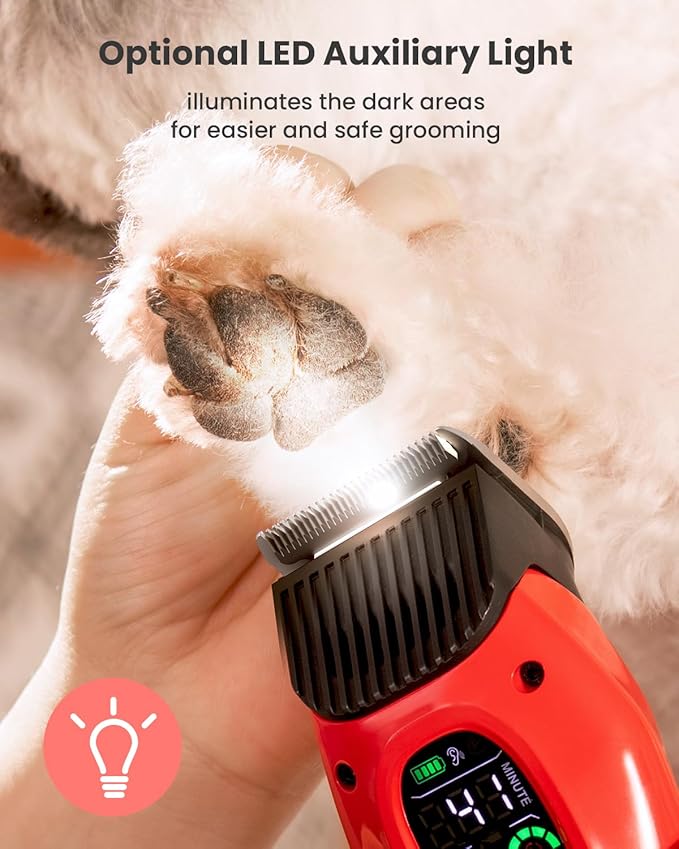 • 【Better Control with Auxiliary Lighting and LED Display】Auxiliary Lighting ensures you have a clear view by Illuminates tricky areas like the paws, underarms and the hygiene area. Besides, large led display will show you the real-time status of the electric clippers like clipping speed, blade service life, remaining operation time, oil blades reminder. Trimming becomes easier and safer.