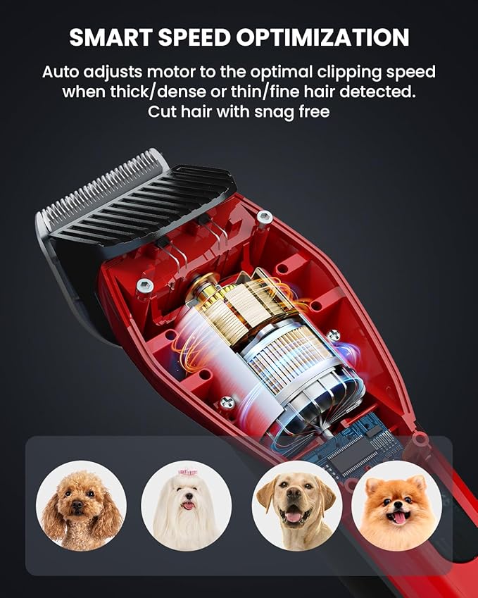 • 【3 Clipping Modes Perfect for All Pets Grooming】Auto speed adjustment under SMART MODE for easily mastering grooming; Switch to TURBO MODE, supercharged by a 8000 RPM professional heavy-duty motor, this pet trimmer cut hair smoothly without hair pulling, even dogs has thick coat or matted hair. Gentle clipping with low noise under QUIET MODE, it’s ultra-friendly for sensitive pets and perfect for precise trimming of ears, faces, belly area.