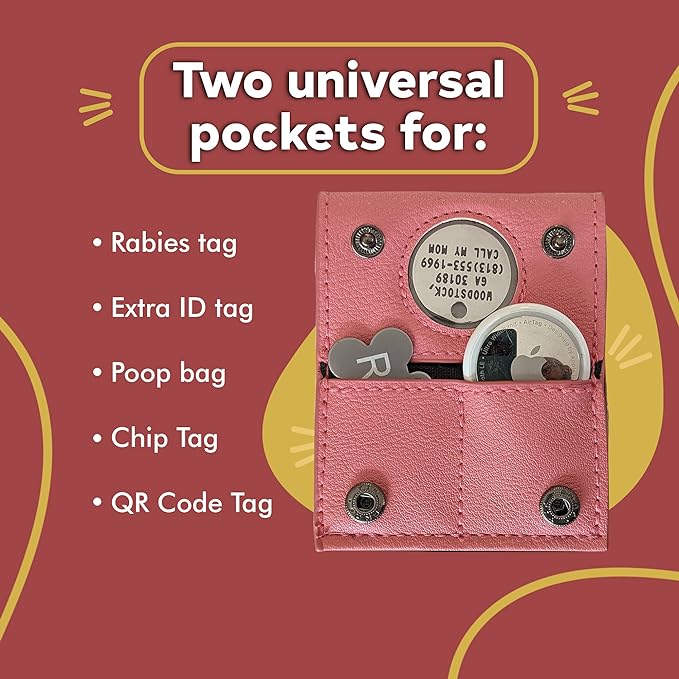 Dog Collar ID Holder - Dog Tag Silencer - No Noise Dog Tag Pouch for Dog Collar - Dog ID Tag Protector - Pockets for Dog accessories, Rabies Tags, Poop bags - Slide on Dog ID - Pet tag (Pink)