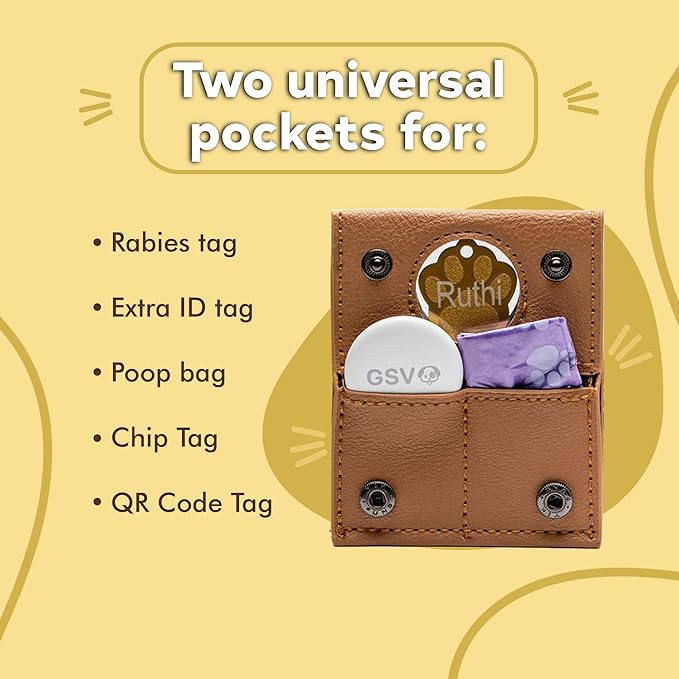 • Carries supplementary necessities: The canine tag holder boasts twin pockets designed to accommodate extra items such as a rabies tag, additional waste bags, or any other essential extras you might find crucial. This guarantees that both you and your dog remain ready for any unforeseen circumstances.
