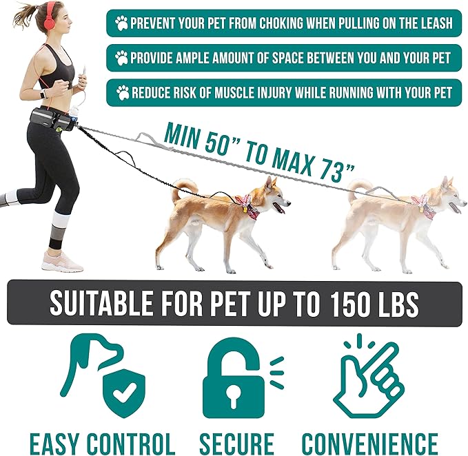 • DESIGNED FOR PET AND YOUR SAFETY: Reinforced and extra padded bungee cord leash so you can grip leash with comfort while on the run. Safety reflective trim on pet waist bag to keep you safe during low visibility environment and night time.