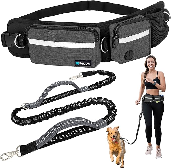 PetAmi Hands Free Dog Leash, Dog Running Leash Belt Bag for Walking, Jogging, Dog Waist Double Zipper Pouch with Poop Bag Dispenser, Dual Padded Handles Reflective Bungee Leash, Single