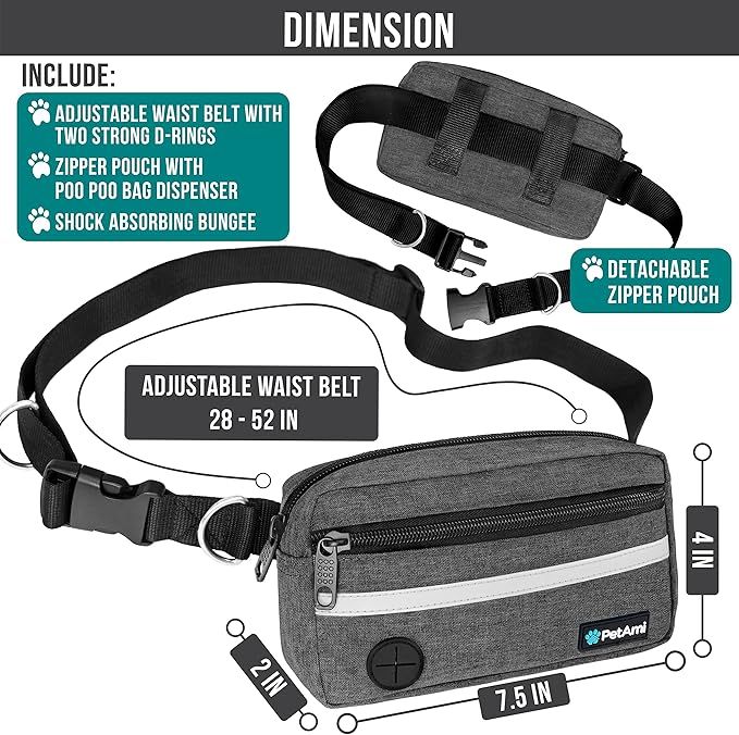 • ADJUSTABLE DOG TREAT TRAINING POUCH: Our wrap around dog hiking fanny pack strap is adjustable from 28 inch to 52 inch to provide a perfect fit for easy walking, backpacking activities with your pet. Featuring a double clip, one fixed and one movable attachment for attaching additional harnesses and waist leash allow for walking 2 dogs. Enjoy walks or runs with ease with PetAmi waist zipper pouch with dog belt leash for your dogs.