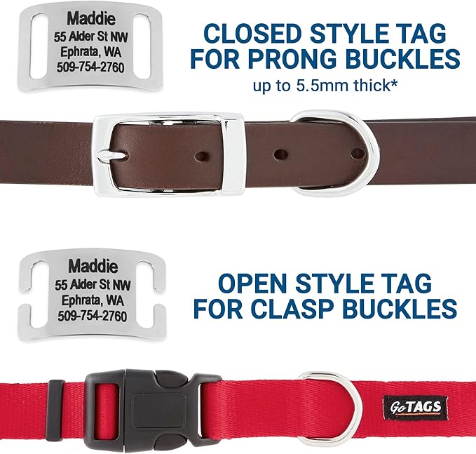 • SELECT TAG STYLE BASED ON YOUR COLLAR TYPE: Open design fits adjustable snap closure collars; Solid design fits belt buckle closure collars.