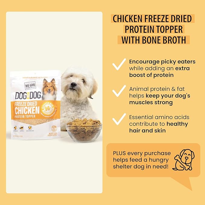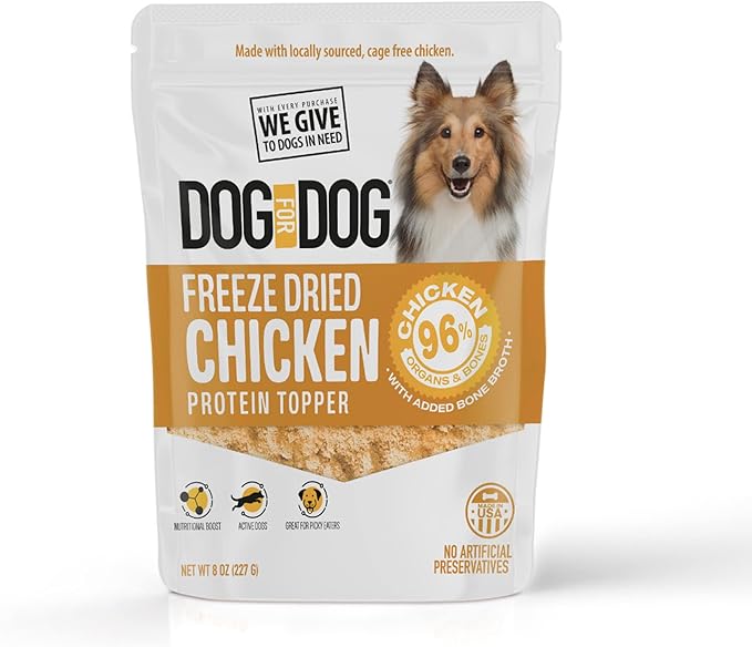 • All-Natural: Made from locally sourced, cage-free chicken, this all-natural topper is composed of 96% organs and bones, without any artificial preservatives or glycerin. With Dog for Dog's freeze-dried chicken protein topper, you can give your dog the high-quality protein he or she deserves.