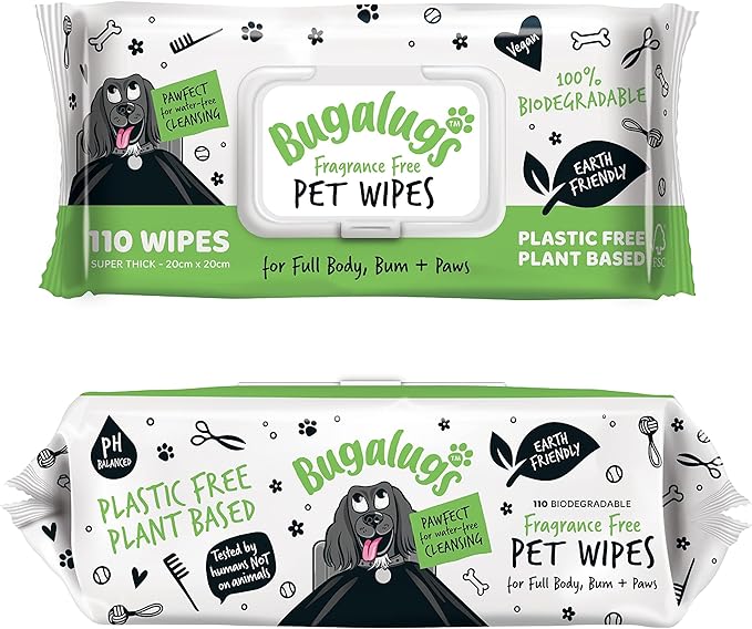 Dog Wipes, 100% Plastic Free Biodegradable pet wipes for full body, eye wipes, ear wipes, bum & paws. 110 sensitive dog grooming wipes for dogs, puppy & cat grooming (Fragrance Free)