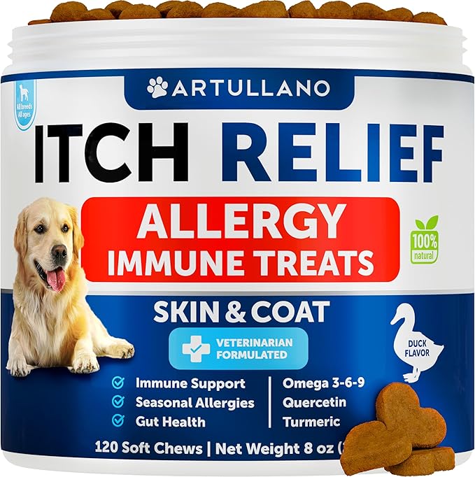 • Formulated with Love: we made chews for allergy relief for dogs itching with natural ingredients and free of added sugar, wheat, & corn. Tasty dog skin and coat supplement is a great aid for dogs of all breeds & ages.