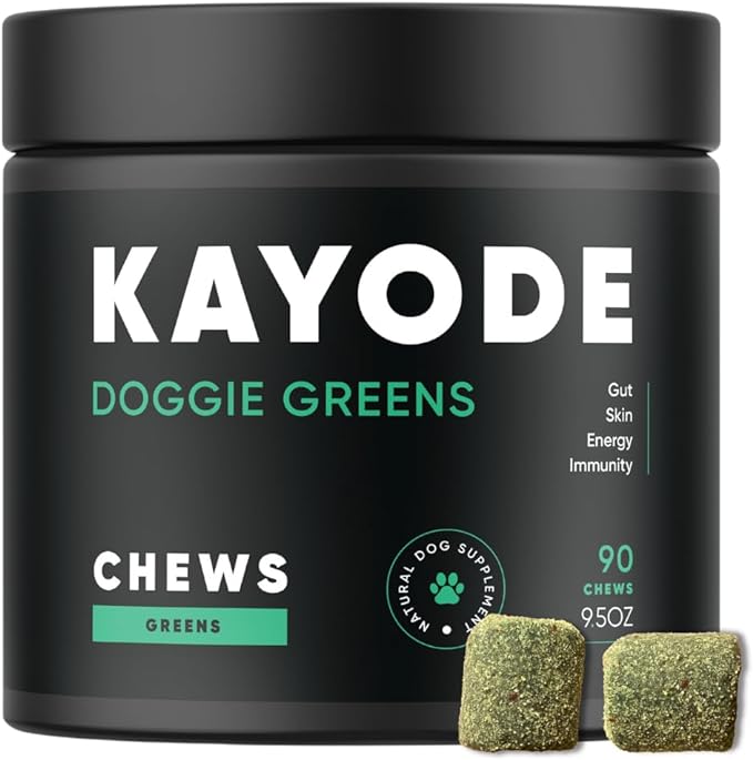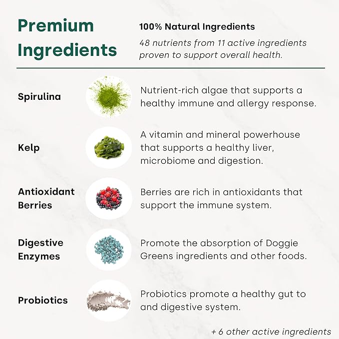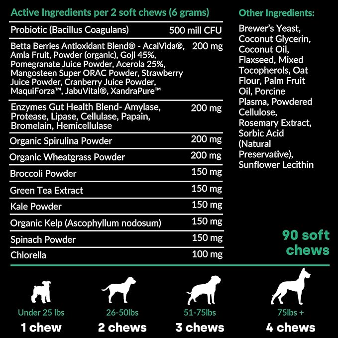 Doggie Greens - Natural Dog Vitamins & Probiotics for Dogs. No Messy Powder. includes Spirulina, Kelp & Antioxidant Berry Mix. 6-in-1 Dog Supplements & Vitamins Chews. Super Greens for Dogs.