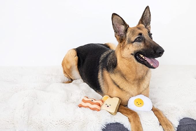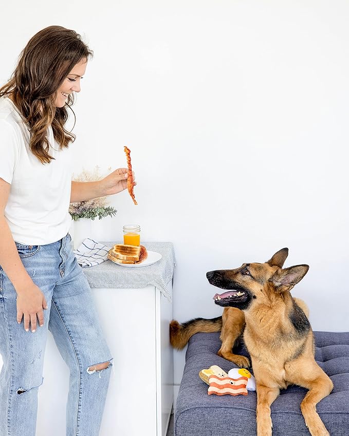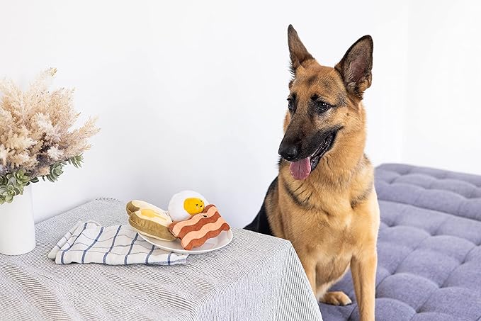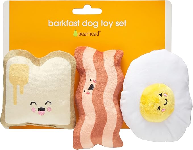 Pearhead Barkfast Dog Toys, Set of 3, Plush Pet Squeaker Toys, Breakfast Dog Toy Set, Toast Bacon & Egg Toy Set, Must Have Pet Accessories for Pet Owners