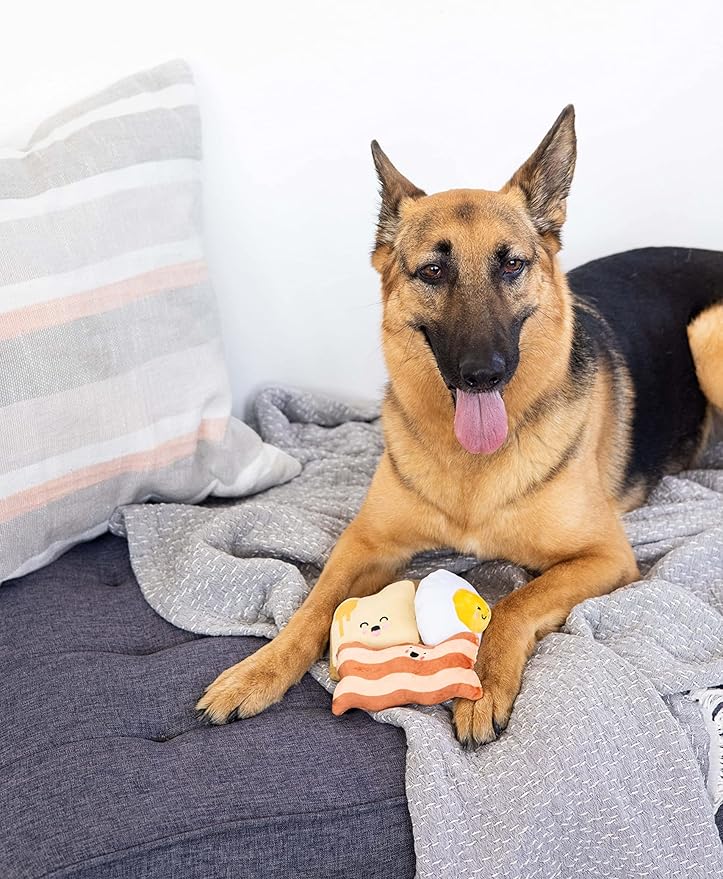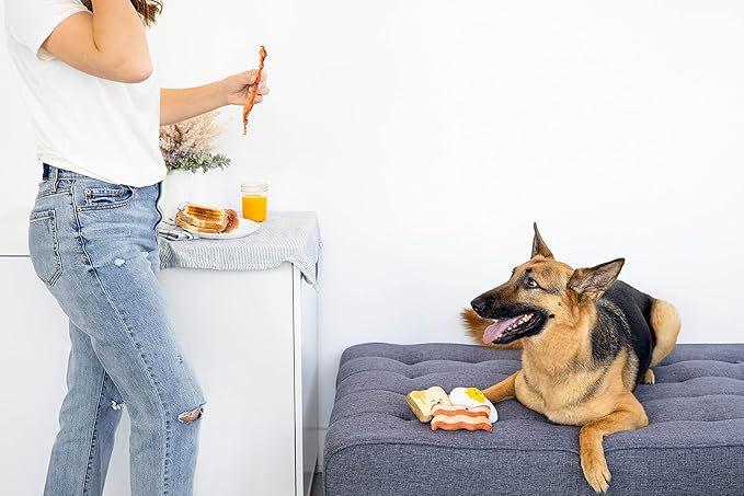 • Includes three plush toys: a fried egg with a squeaker and crinkle paper, buttery toast with a squeaker, and sizzling bacon that crinkles