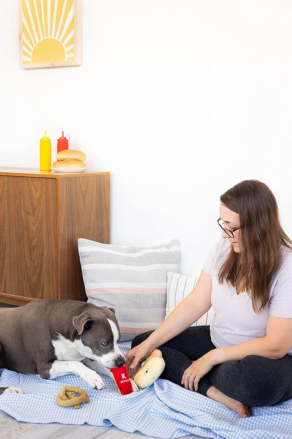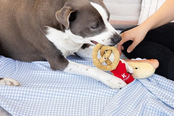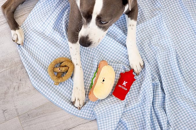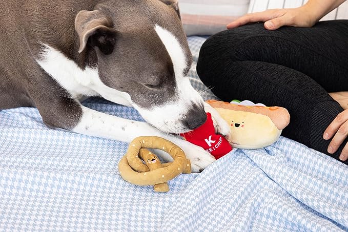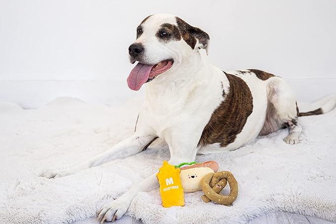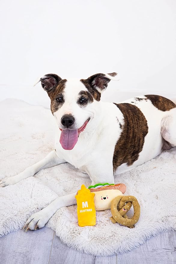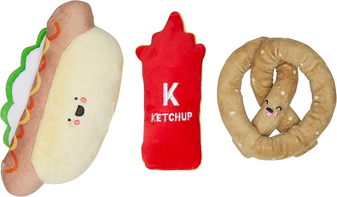 • Includes three plush toys: squeaky hot dog in a bun with all the fixings, a double-sided mustard and ketchup bottle that crinkles, and a jumbo salted pretzel with a squeaker