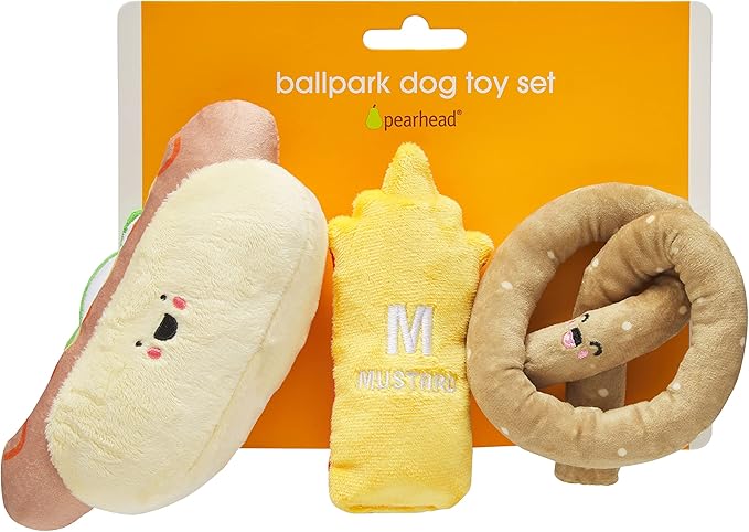Pearhead Ballpark Dog Toys, Set of 3, Plush Chew Toys for Dogs, Ketchup Pretzel & Hotdog Dog Toy Set, Must Have Pet Accessories for Dog Owners