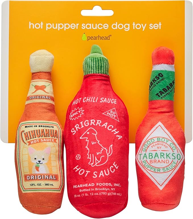 Pearhead Hot Sauce Dog Toys, Set of 3, Hot Sauce Toy Set for Dogs, Must Have Toys for Pet Owners, Plush Chew Toys Set of 3
