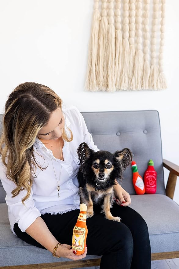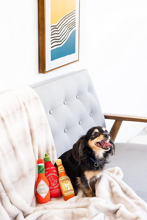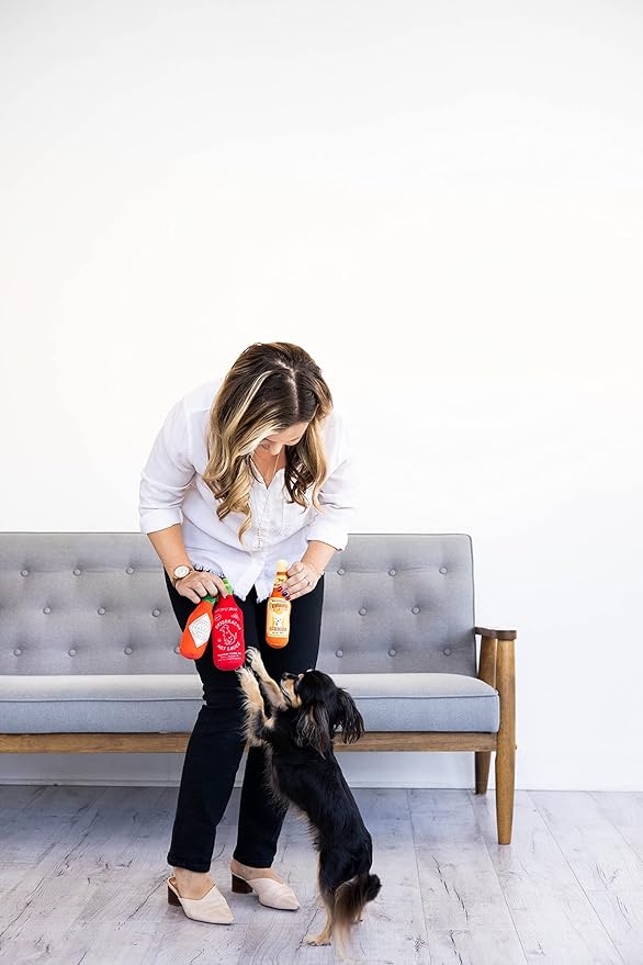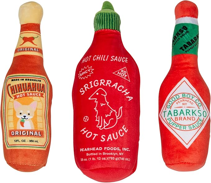 • Includes three squeaky hot sauce bottle toys: orange and yellow chihuahua hot sauce, red and green tabarkso, and red and green srigrracha hot chili sauce