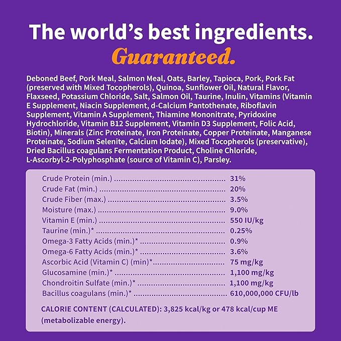 • Optimize your dog's well-being with our science-backed nutrition, supporting top 5 health needs: Digestive health with live probiotics, Heart & Immunity Support with guaranteed taurine and vitamin E, Healthy Skin & Coat enriched with omega-3 and omega-6 fatty acids, and Hip & Joint Support featuring leading levels of glucosamine and chondroitin.