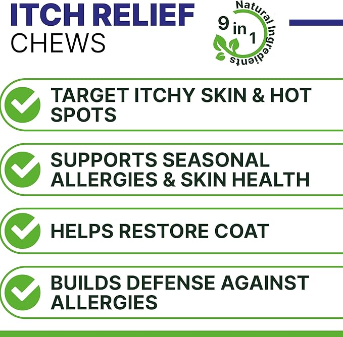 • Itch & Allergy Relief with Omega-3 for Dogs - this chewable allergy relief supplement helps with seasonal and environmental allergies, easy allergy symptoms like itching, paws leaking and other. And with 6 strain probiotics blend, this treats also work to promote general health and fortify immunity.