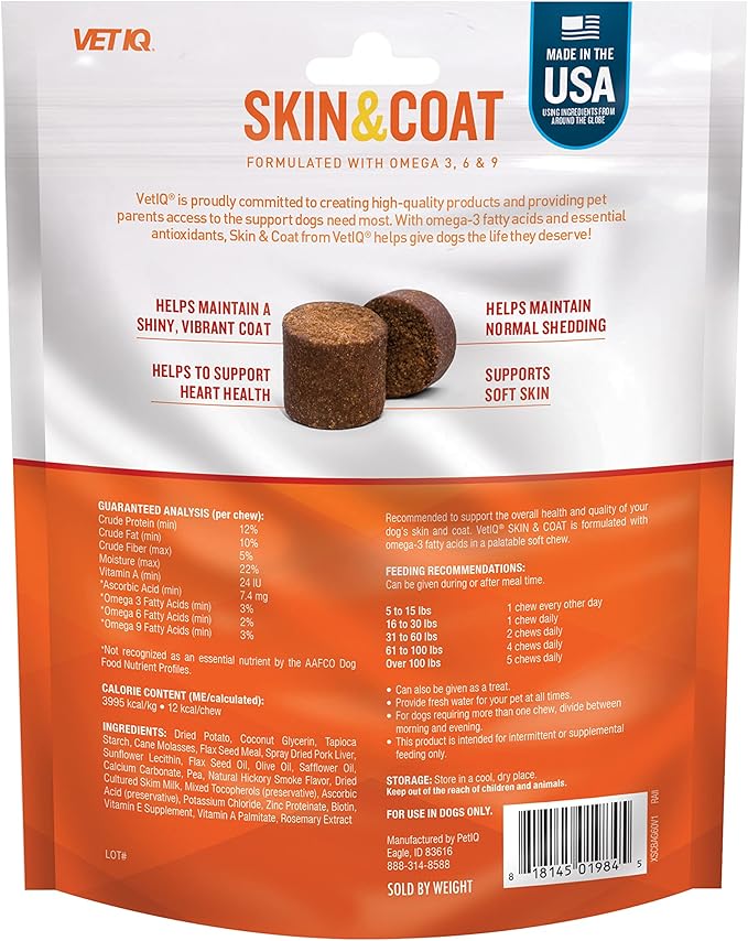 VetIQ Skin and Coat Supplement for Dogs, Helps Maintain Healthy Skin and Shiny Coat, Hickory Smoke Flavor Dog Chew, Made in The USA, 60 Count