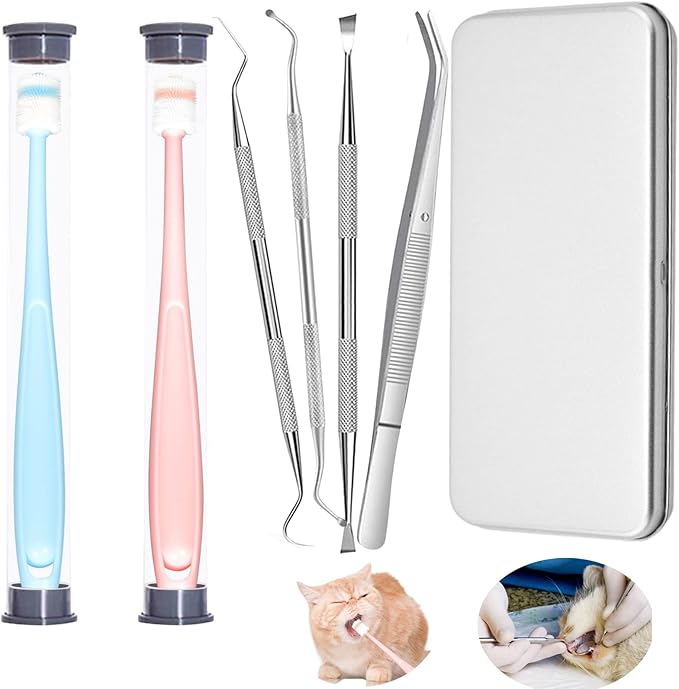 Cat & Small dog Dental Care Tooth Brushing Kit,2 PCS 360 Degree Soft Silicone,Independent Packaging,360°Pinching Teeth for Easy Puppy Teeth Cleaning+ 4 PCS Stainless Steel Calculus & Plaque Remover