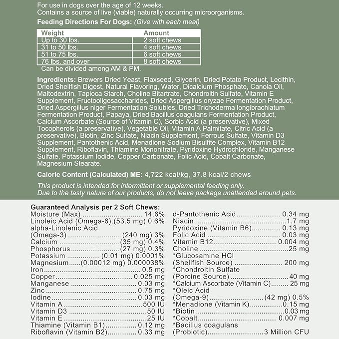 • HIP & JOINT HEALTH: Along with the omega blend, this pet multivitamin includes glucosamine and chondroitin to help improve the health of your dog's joints, hips, muscles, cartilage, and bones. Great for younger and senior pets too!