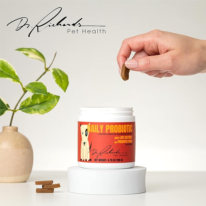 • Easy to Use - Simply add one Dr. Richard's Daily Probiotic chew to food, or feed as a treat, for every 25 pounds of body weight. Most dogs gobble them up without a problem. It is much easier than trying to get a dog to swallow a pill. This will quickly become your favorite canine supplement for a more active life