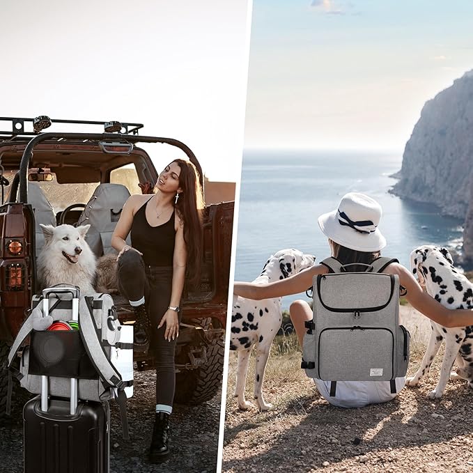 • MULTI-COMPARTMENT DOG TRAVEL BAG: This large dog backpack has a large inner compartment to store dog food, dog travel water dispenser, dog beach essentials and so on. The side pocket of this dog accessories backpack with zipper is for extracting tissue and dog poop bags. The top pocket on the dog travel bag is easy for you to hold your daily stuffs.The front pocket also folds down as a mat for easy and convenient pet feeding