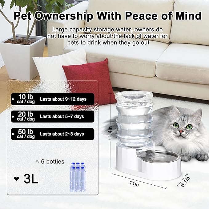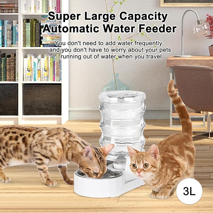 • 【Large Capacity】 The water dispenser is suitable for small cats and dogs, when the water level of the water feeder drops to a certain extent, the water will flow into the water bowl through the action of gravity, adding water to extend the hydration time, 3L capacity, to ensure that the cat's daily drinking water, very suitable for business trips or busy pet owners, do not worry about pet water shortage.