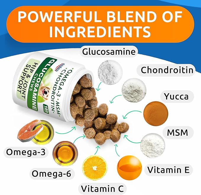 • Vet-Approved Formula: With glucosamine, chondroitin, MSM sulfate & Omega-3-6, our dog hip and joint supplement is the best natural support for your buddy's mobility. Plus, these bites extend the benefits to your pup's flexibility and comfort.