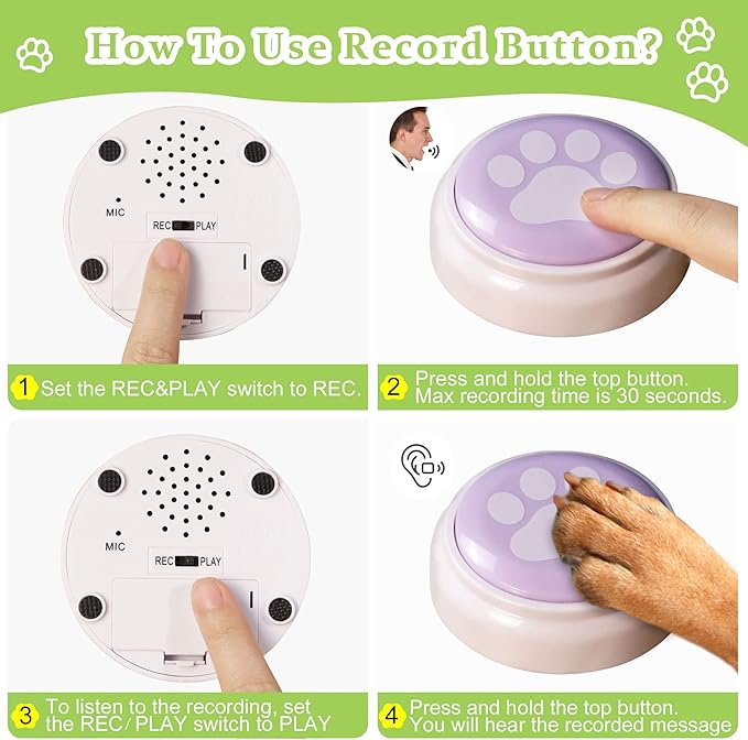 • Easy to Use: The dog buttons for communication are easy to use. Swith to REC, press and hold the top button to hear a "beep", and start recording a 30 second voice message. When the recording is finished, release the talking button and hear the "beep-beep" sound. Swith to PLAY, press the recordable button to play the recording.