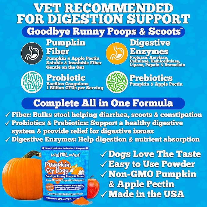 • Well Loved Pumpkin for Dogs is an advanced formula with prebiotics, fiber, probiotic for dogs and digestive enzymes. High in fiber with pumpkin powder for dogs and apple pectin to prevent and relieve dog diarrhea, constipation, upset stomach, bloating, gas, firms up loose poop and supports digestive regularity and gut health.