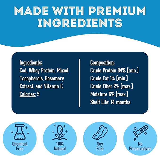 • EXCEPTIONAL TRAINING TREATS FOR DOGS & CATS - Wild cod are a high-value treat to reward good behavior and reinforce the bond between you and your furry companion. Don’t settle for other puppy training treats that lack vital protein. We take pride in creating treats that are free from harmful chemicals or artificial additives. Your pets deserve an all-natural, premium treat. Our dedication to purity ensures that these are ideal cat treats and dog treats, providing the best for your furry family.