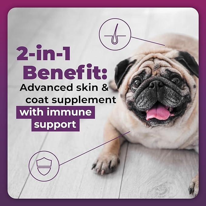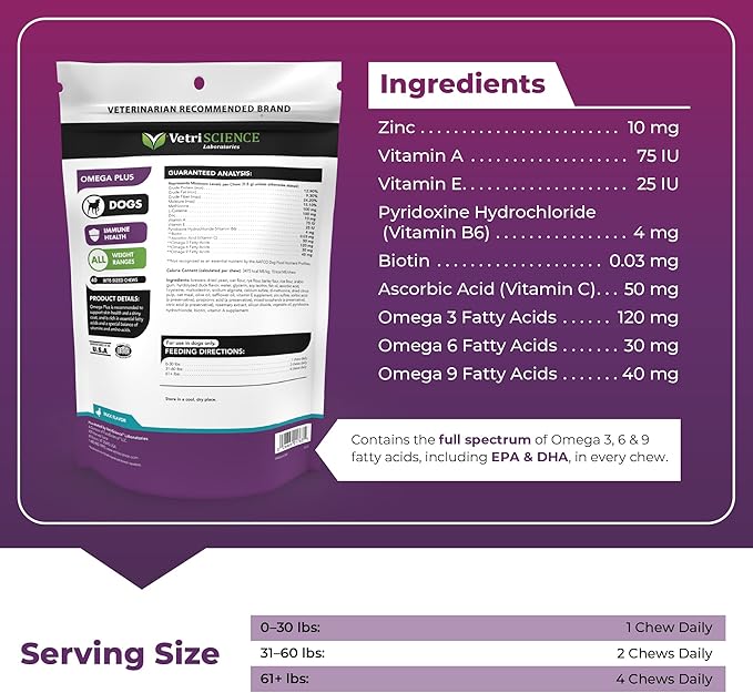 • Biotin for Hair and Nails: Dry, itchy skin can lead to thinning hair and dull coats. Omega Plus includes 30 mcg of biotin in every chew to strengthen hair and stimulate new hair growth. Suitable for all coat types.