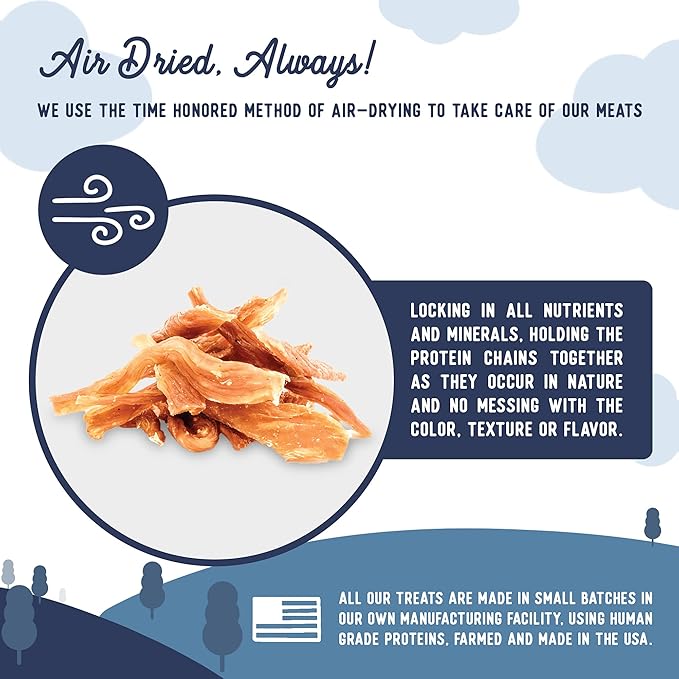 • DELICIOUSLY SIMPLE NATURAL DOG TREATS - Experience the pure essence of our single ingredient dog jerky treats, composed solely of succulent turkey! Your canine companion will devour our slow air-dried turkey strips for dogs. Among dog treats, turkey jerky for dogs reigns supreme in richness, nutritional value, and flavor. Our single ingredient dog treats are sourced from local farms, guaranteeing their wholesome origin! Always free from sugars, grains, and fillers for your best friend!