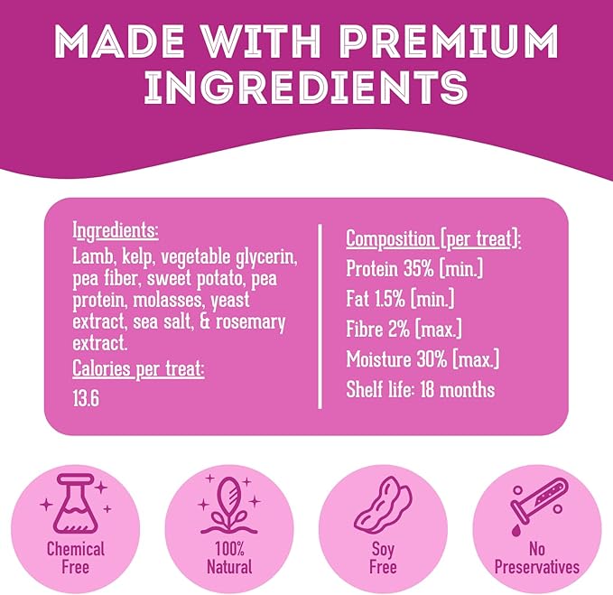 • NATURAL TREATS FOR DOGS & CATS HIGH IN PROTEIN - Our lamb and kelp treats for dogs are 100% natural, filled with nutrient-rich lamb meat, Omega 3 fatty acids, and vitamins and minerals such as Iron, Zinc, and Vitamin D. These cat and dog lamb treats are chemical-free with zero additives or preservatives, making them the ultimate choice for cat treats and dog treats alike. With these soft and chewy dog treats your furry family will receive the finest in nutritional support!