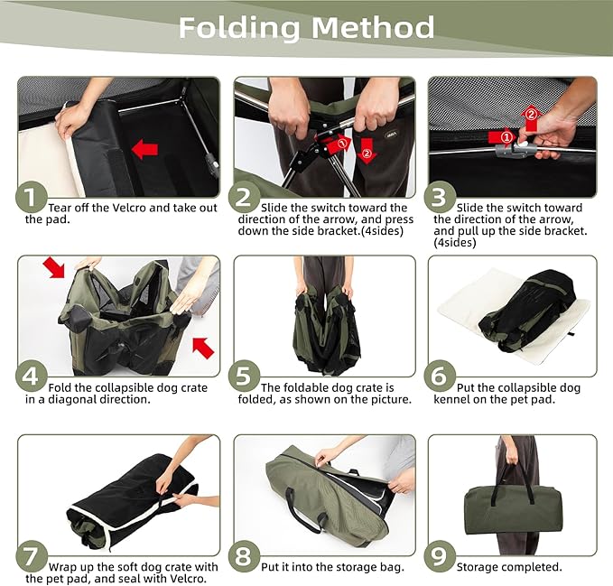 • 🐶HIGH-QUALITY STAINLESS STEEL TUBE: The collapsible dog crate is made of green stainless steel and does not use paint, ensuring resistance to beach conditions. The dog travel crate provides you with a safe worry-free outdoor experience.
