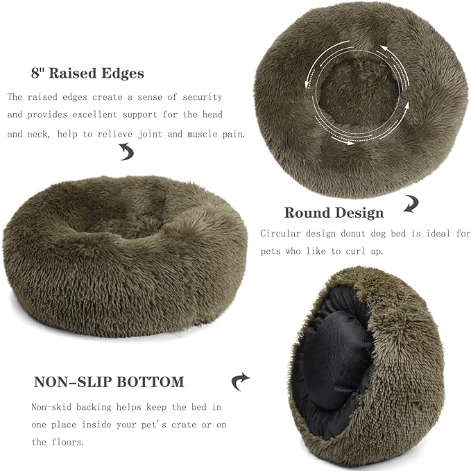 • The dog calming bed is about 30”x 30”x 7'', perfect for medium dog up to 30 lbs to curl up or sprawl on the fuzzy dog bed, this orthopedic dog beds is finished with faux shag fur, ultra soft, warm and comfortable, Satisfies the nesting instinct of dogs who tend to curl up when they sleep.