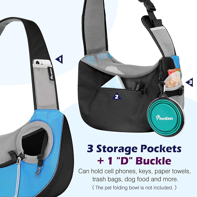 Pawaboo Pet Dog Sling Carrier, Hand Free Drawstring Dog Papoose with Adjustable Strap, Breathable Mesh Bag for Puppy Cat, Crossbody Satchel Dog Purse with Pocket for Outdoor Travel, Light Blue, Medium