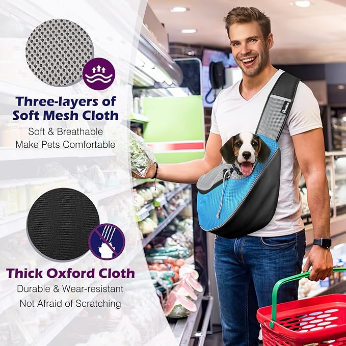 • 【Safety Guarantee】 Made of oxford cloth and air mesh, this pet sling carrier is stretchy and provides cushioning protection for your pet. The drawstring prevents the dog from accidentally opening the zipper, while also preventing him from chewing the sling bag. Built-in safety collar hook, you can buckle it to the dog's collar or harness to prevent it from falling off.