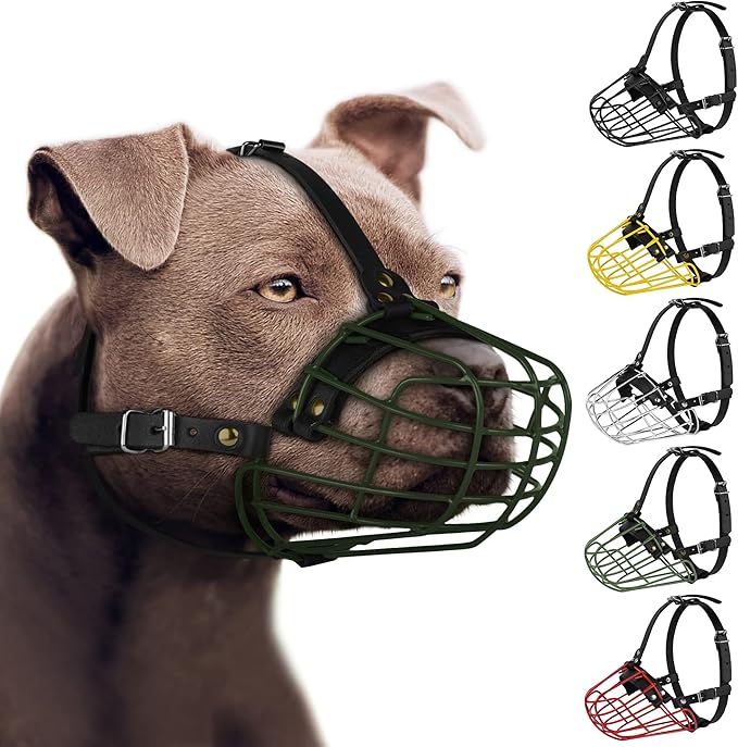 Pitbull Dog Muzzle Metal Mask Amstaff Secure Wire Basket Adjustable Durable Leather Straps for Large Dogs (Green)