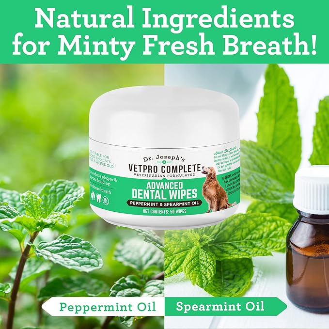 Dr. Joseph’s VetPro Advanced Dog Dental Wipes, 50 Count, Easy Teeth Cleaner for Dogs and Cats with Peppermint and Spearmint, Freshens Breath, Reduces Tartar