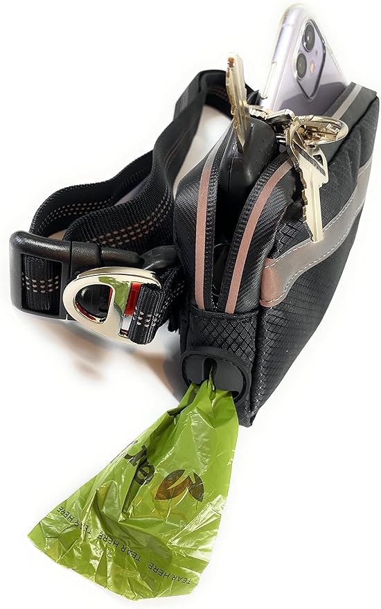 • REMOVABLE, MULTI-FUNCTION, WEATHERPROOF ZIPPER POUCH – Size: 7 X 4 X 1 inch. The Enthusiast Gear dog running leash comes with an easily removable waterproof zipper waist pack with 2 pocket compartments giving you easy access to your smartphone, keys, dog treats, and supply of poop bags.